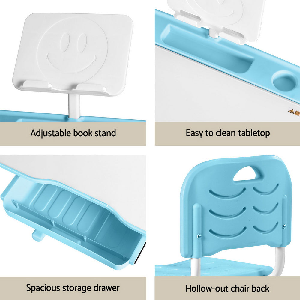 Table and Chair Adjustable Study Desk w/ LED Lamp Blue: Create a cosy learning corner with the Keezi Kids Table Chair Set featuring a built-in LED lamp and adjustable design. Perfect for growing children, this study desk adapts to your child's height with smooth adjustments, ensuring ergonomic comfort during homework, crafts, or reading sessions. The built-in LED lamp provides gentle, eye-friendly lighting, while the handy book stand keeps stories and textbooks at the perfect angle. Made from non-toxic, wipe-clean PP material and reinforced with sturdy construction, this set prioritises safety with rounded edges and a robust build. The roomy storage drawer encourages tidiness, and fuss-free assembly means more playtime, less setup time. A practical gift that grows with toddlers and school-aged kids alike!